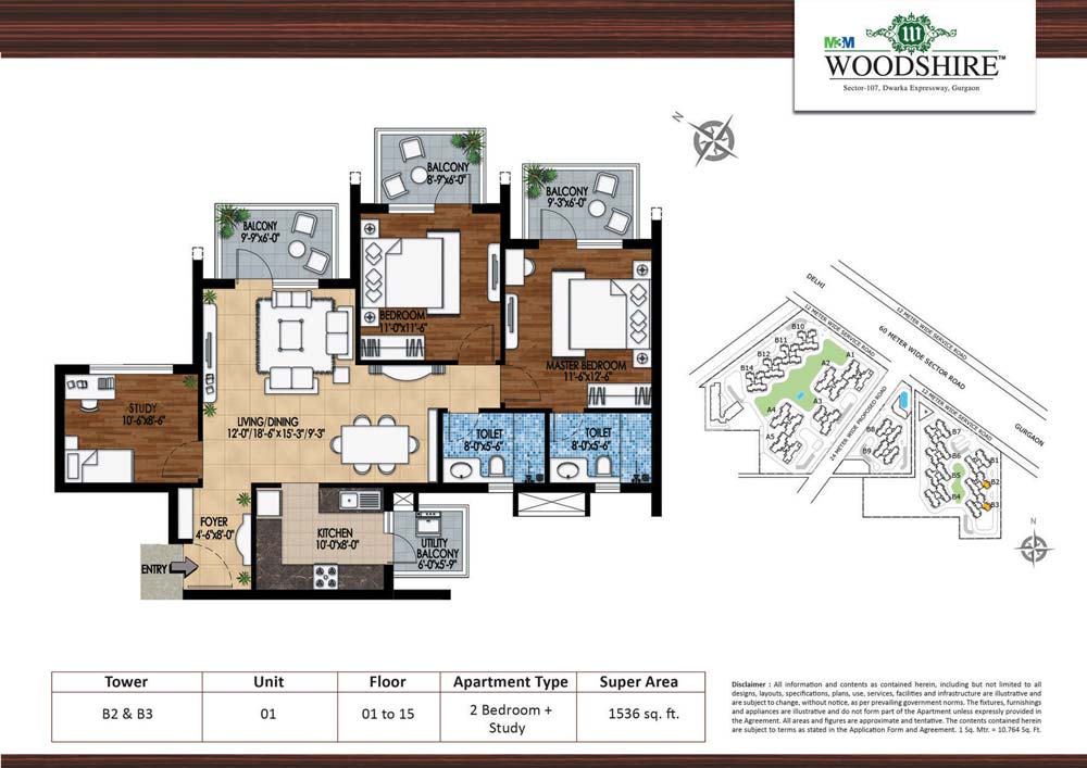 2 BHK + Study, Tower - B2 & B3, Unit - 01, Area : 1536 sq.ft.