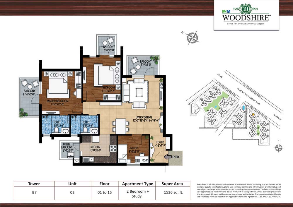 2 BHK + Study, Tower - B7, Unit - 02, Area : 1536 sq.ft.