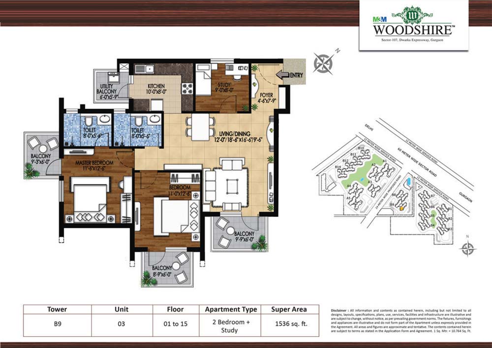 2 BHK + Study, Tower - B9 , Unit - 03, Area : 1536 sq.ft.